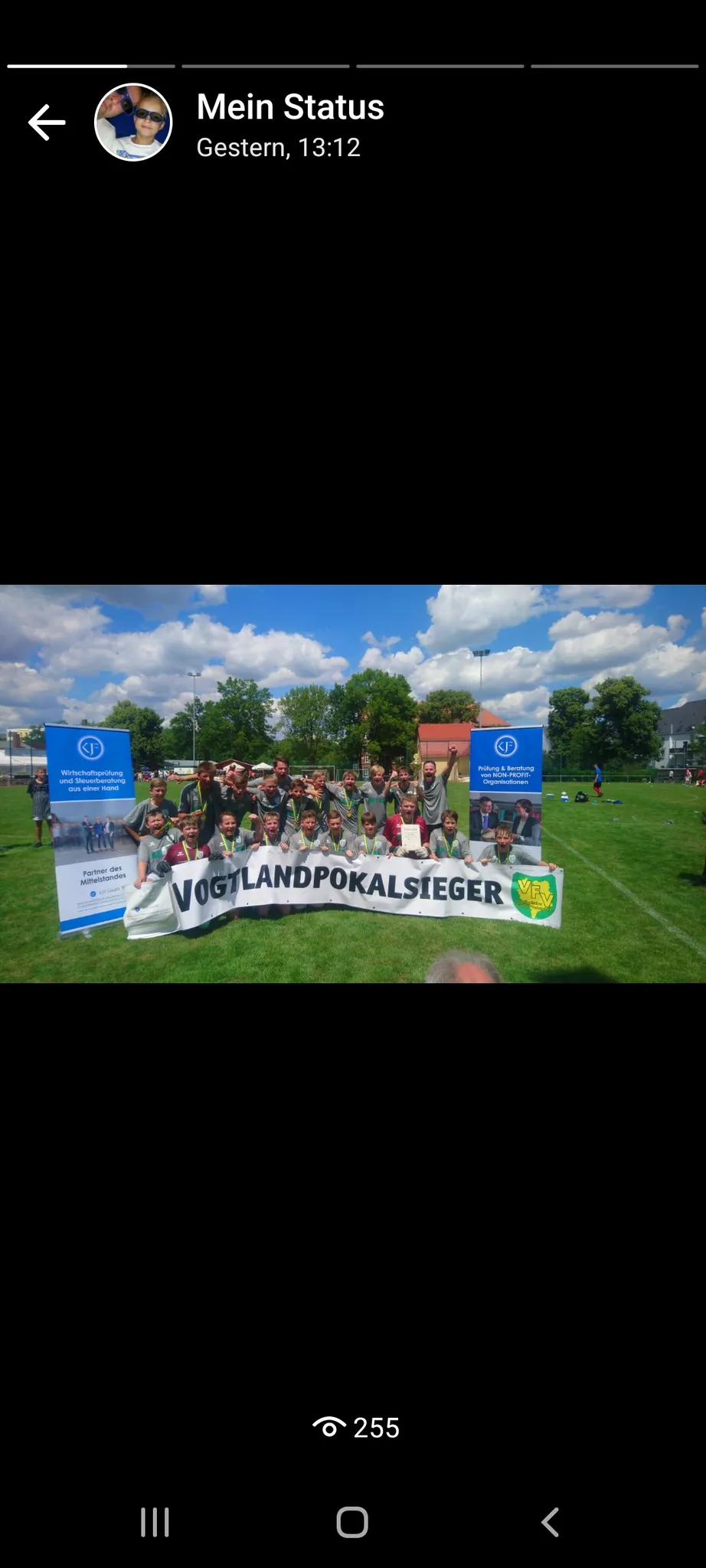 Was dann in den letzten Minuten des Spiels passierte, kam einem Thriller gleich. Die Lengenfelder gaben sich nicht auf und kämpften bis zum Schluß um den Ausgleich. 2 Minuten vor Ende der reguIären Spielzeit, war es ein Freistoß auf Höhe der Mittellinie, der hoch in unseren Strafraum getreten wurde, wir wehrten den Ball zu kurz ab und aus ca. 12m schlug der Ball im rechten unteren Eck unseres Tores ein, 3:3. Es brach die letzte Spielminute an und unsere Jungs zeigten weiter, dass wir heute hier den Pokal mitnehmen wollten! Nach einem Eckball, getreten von Curt, kam der Ball im Strafraum zu Felix, unzählige Abwehrbeine waren um ihn herum aber unser Felix behielt die Übersicht und fand die einzige Lücke und schob scharf und überlegt zum 4:3 ein. Jubel und Freude unserer Jungs und bei unseren stimmungsvollen Fans. 3 Minuten Nachspielzeit wurden angezeigt, die galt es also noch zu überstehen. Wir machten es weiter gut, weil wir uns nicht hinten rein stellten, sondern immer wieder über Ole mit Felix und Cedrik nach vorn spielten. In der letzten Minute der Nachspielzeit hatte dieser Krimi noch einen Höhepunkt parat. Lengenfeld spielte sich über rechts durch, wir erkämpften uns den Ball und spielten einen Rückpass auf unseren Hüter. Beim Versuch den Ball weit zu schlagen, traf er aber den Ball nicht, dieser rollte langsam quer durch unseren Strafraum und zum Glück stand dort nur unser Jakob, da auch die Lengenfelder zu überrascht waren, konnten wir klären. Danach schaute der gute und souveräne Schiri auf die Uhr und alle unsere Fans auf den Schiri... Schlußpfiff!!! Grenzenloser Jubel auf und neben dem Feld!